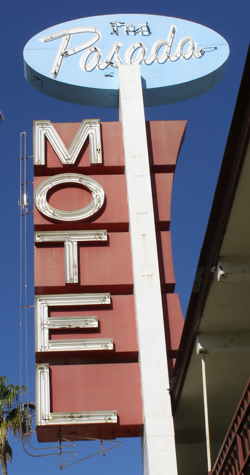 The Pasada Motel was originally known as the "Pasadia Motor Hotel." This sign is probably from the 1950s or 1960s. This photo is from 2008. Since then, the sign has been repainted and the "Motel" is now composed of plastic letters. [map] The Pasadena Playhouse sign was built in 1935. It was restored in 2020. [map] |
