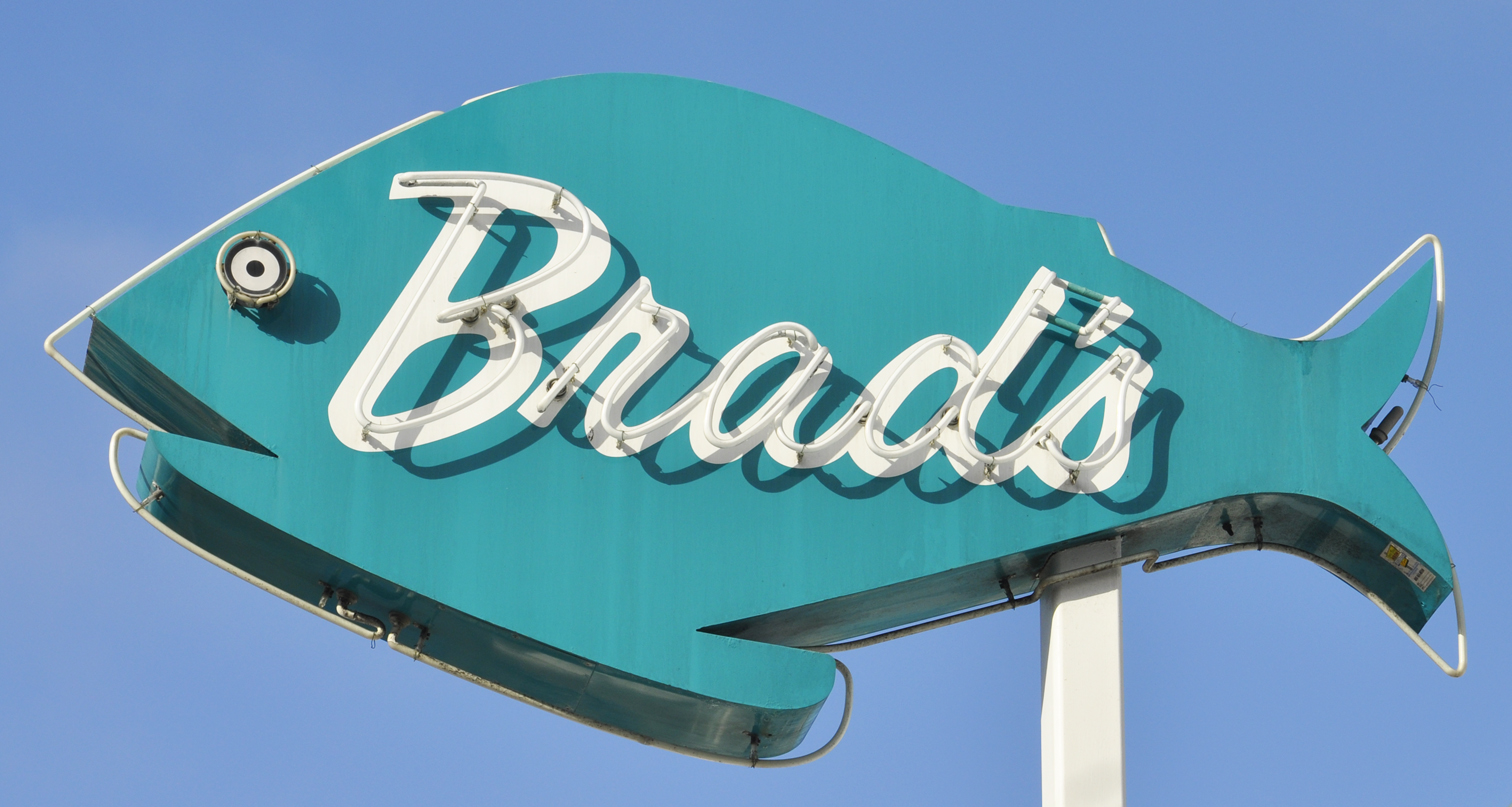 | Brad's Restaurant opened in 1952. This may be a replica sign. There was originally a much larger rooftop version on the hotel behind the restaurant which read "Brad's Restaurant." For more, see this website. [map] |