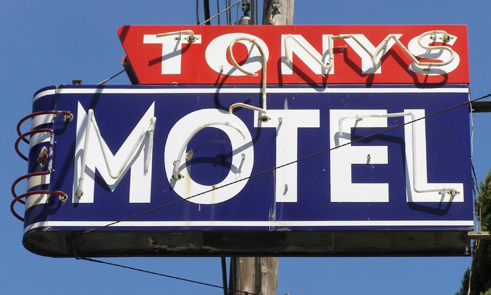 I assume that Tony's Motel, which is just down the street from Tony's Cocktails, was owned by the same man. The "Tony's" panel might have been a later addition or replacement for a name change. The sign was removed in 2016. The Woodland Court Motel sign was probably from the 1950s or earlier. The panels were previously painted red. The sign was removed in 2012. It is now in a private collection. For more, see this website. |