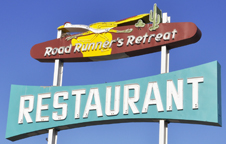 | The Road Runner's Retreat was built in 1961 and this sign is from then. The motel has been closed since the mid-1970s. The sign was repainted in 2024 and the neon was restored in 2025. For more, see these websites: 1 and 2. [map] |