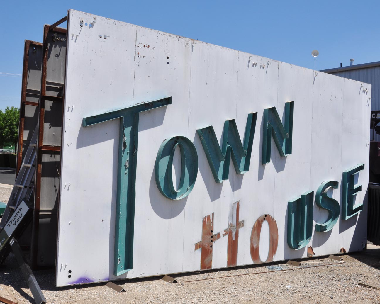 | The Town House Motor Hotel had been here since at least the 1950s. The sign appears to be from then. By 2013, the sign had been repainted. By 2019, the sign was part of the sign collection at CNI Signmakers. |