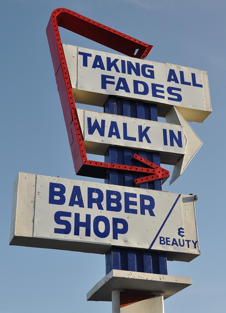 | The Dallas Drive-in Cleaners sign had been stripped of neon and bulbs by 2008. By 2013, it had been repainted for a barber shop. |