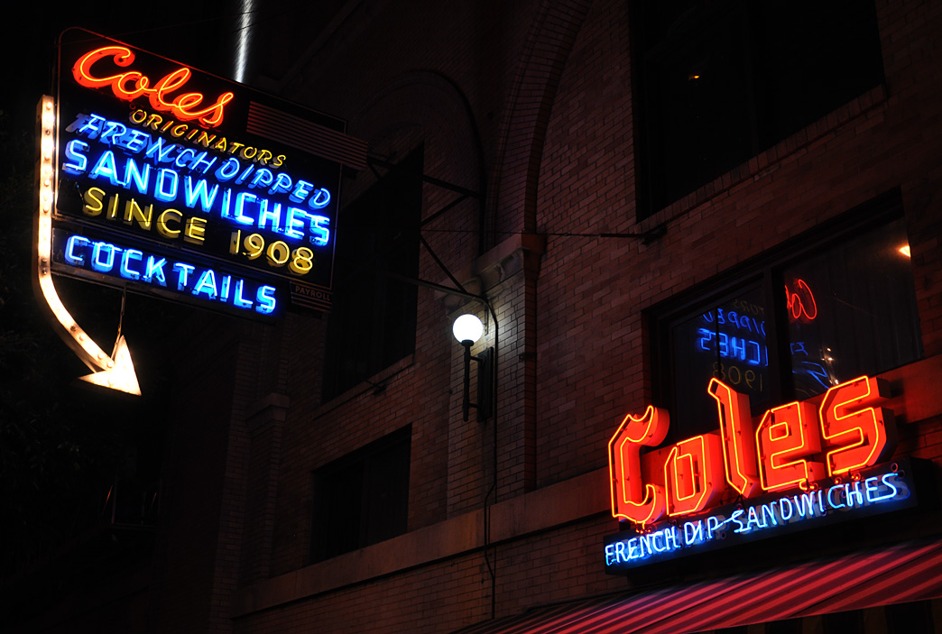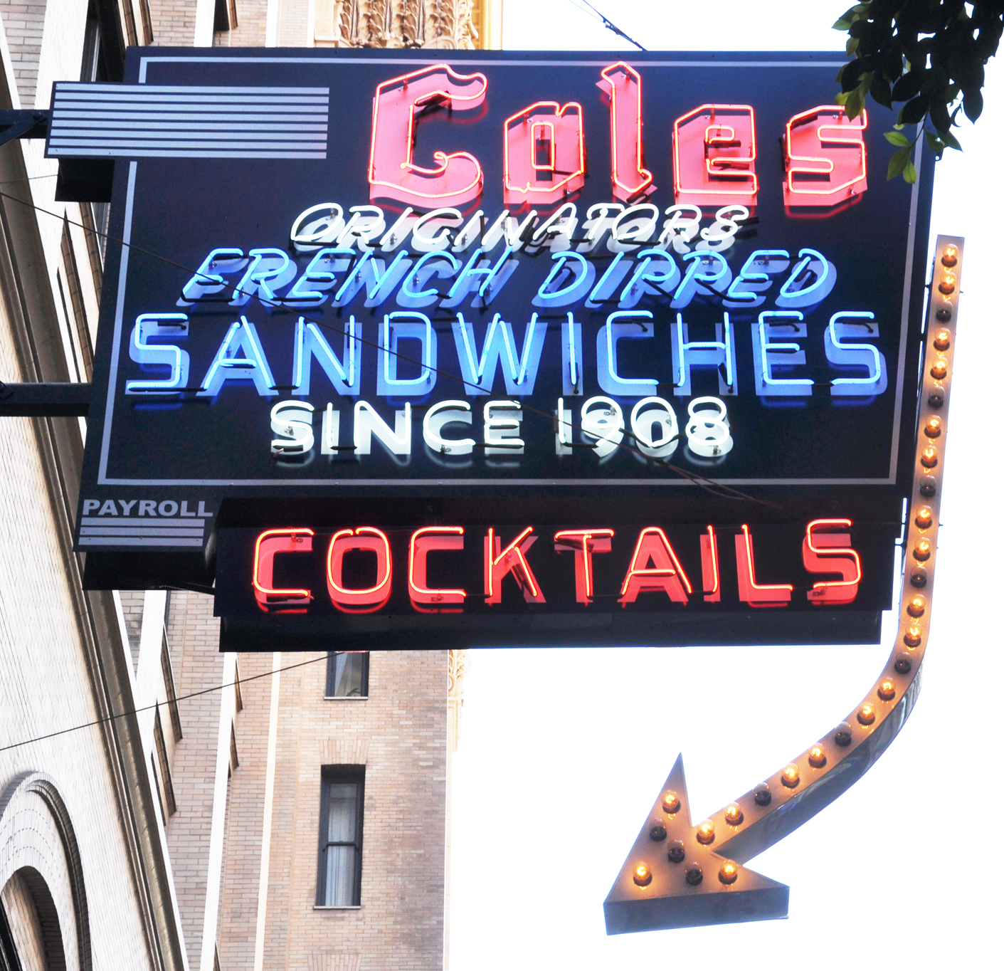 | Cole's French Dip opened in 1908. These signs are probably from the 1950s. They were restored in 2008. The sign reads "Originators Since 2008" under the "Since 1908" add-on panel. However, I believe the panels originally read "Checks Cashed" in that spot. In 2022, a replica of the projecting sign was built and installed. The sign on the building was removed in 2022. It was restored and reinstalled in 2023. For more, see these websites: 1 and 2. [map] |