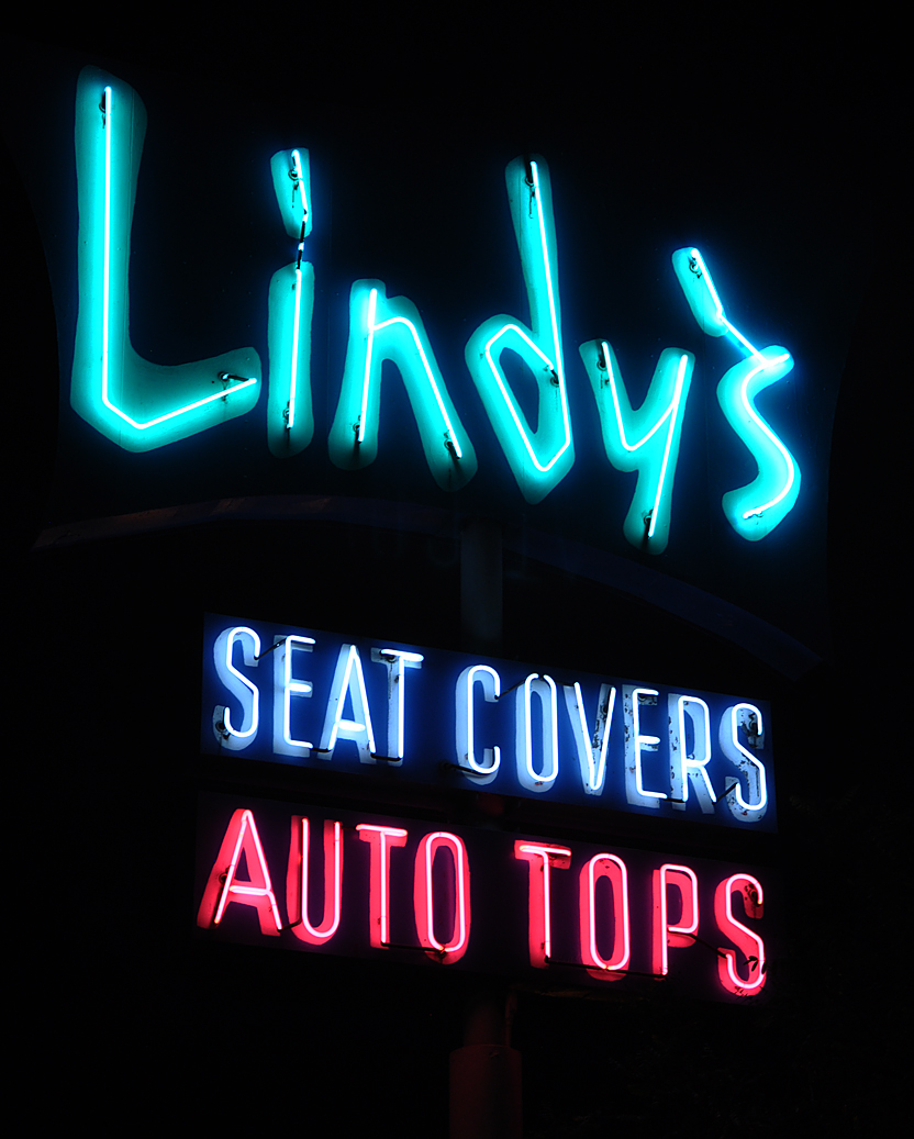 This Lindy's Auto Upholstery sign is probably from the early 1960s. I don't know if it is lit at night but the neon appears to be in good shape. [day photo thanks Gregory May] [map] |