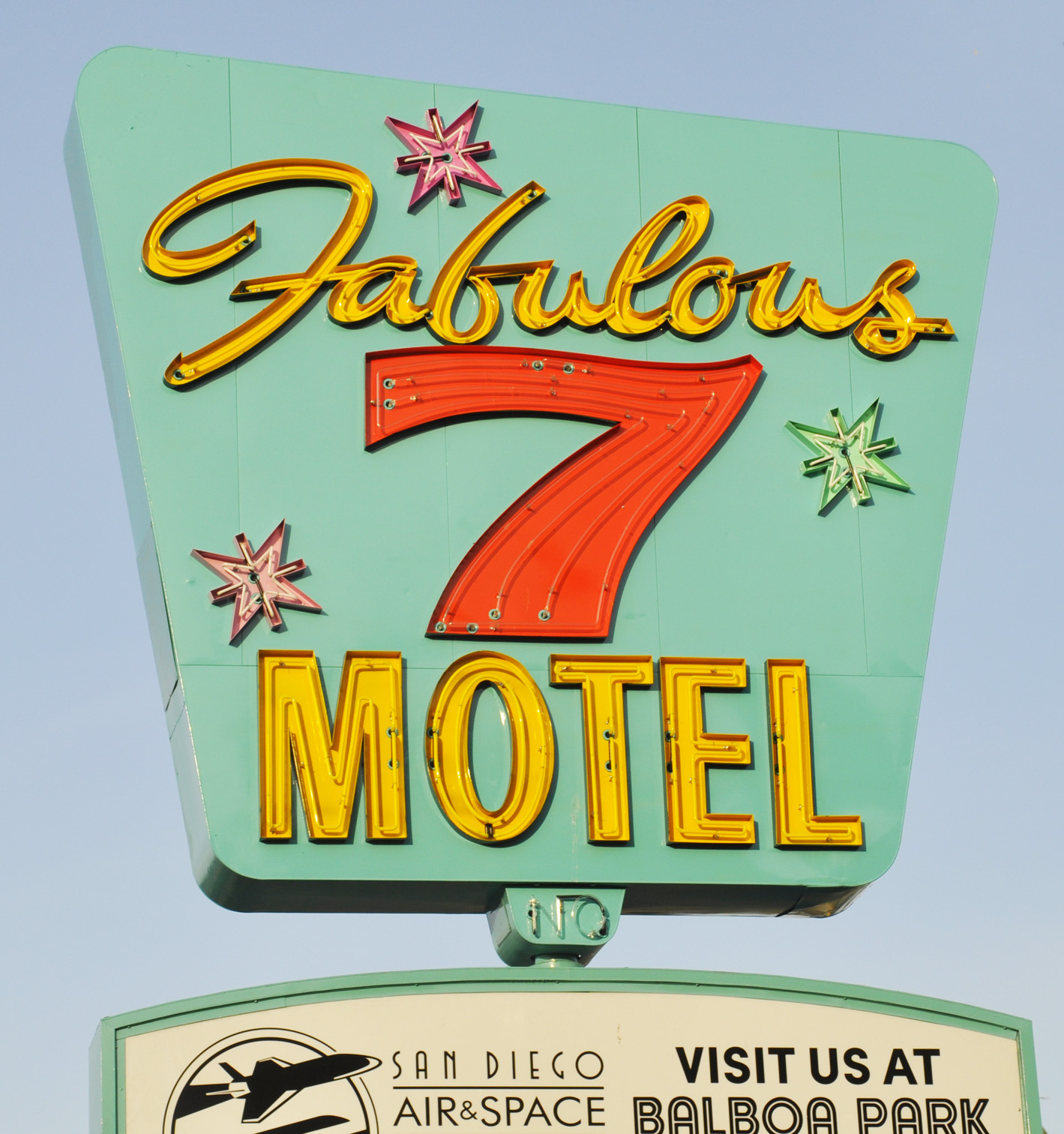 | >The Fabulous 7 Motel was built around 1966 as the Fabulous Five-Seven Motel. For one guest, you paid $5. If you had two to five people in your party, you paid $7. When the $5 price went away in the late 1960s, the motel was renamed the Fabulous 7 Motel and a new sign was installed in front of the motel. By 1971, this neon sign was installed behind the motel next to I-8. The background was originally painted blue, the "7" was pink, and the other letters were yellow. The top of the readerboard mentioned the adjacent restaurant. The motel now houses a transitional living center. In 2024, a GoFundMe fundraising campaign was started towards restoring the sign. It was restored in 2026. For more, see this website. [map] |