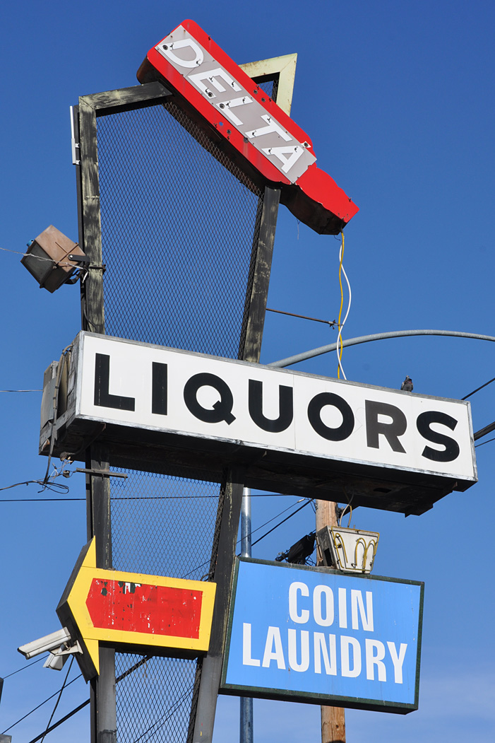 The Delta Market & Liquors signs are located on the same lot. The liquor store apparently had a different name originally. The signs are probably from the 1950s. The liquor store sign's pouring bottle must have been animated. [map] |