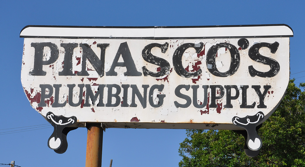 Pinasco Plumbing & Heating was established in 1957. This sign appears to be from then. It probably had neon originally. This photo is from 2014. By 2016, the sign had been covered with panels for Santa Maria Party. [map]