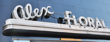 | Alex Floral opened in 1949. The neon sign and vitrolite tiles are probably from then. The skeleton sign in the window might have been added later. [map] |
