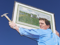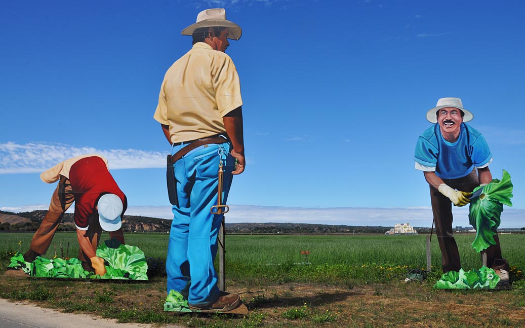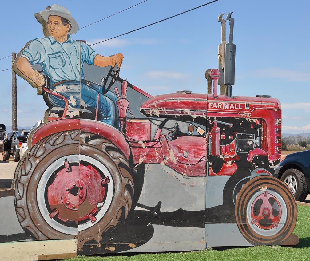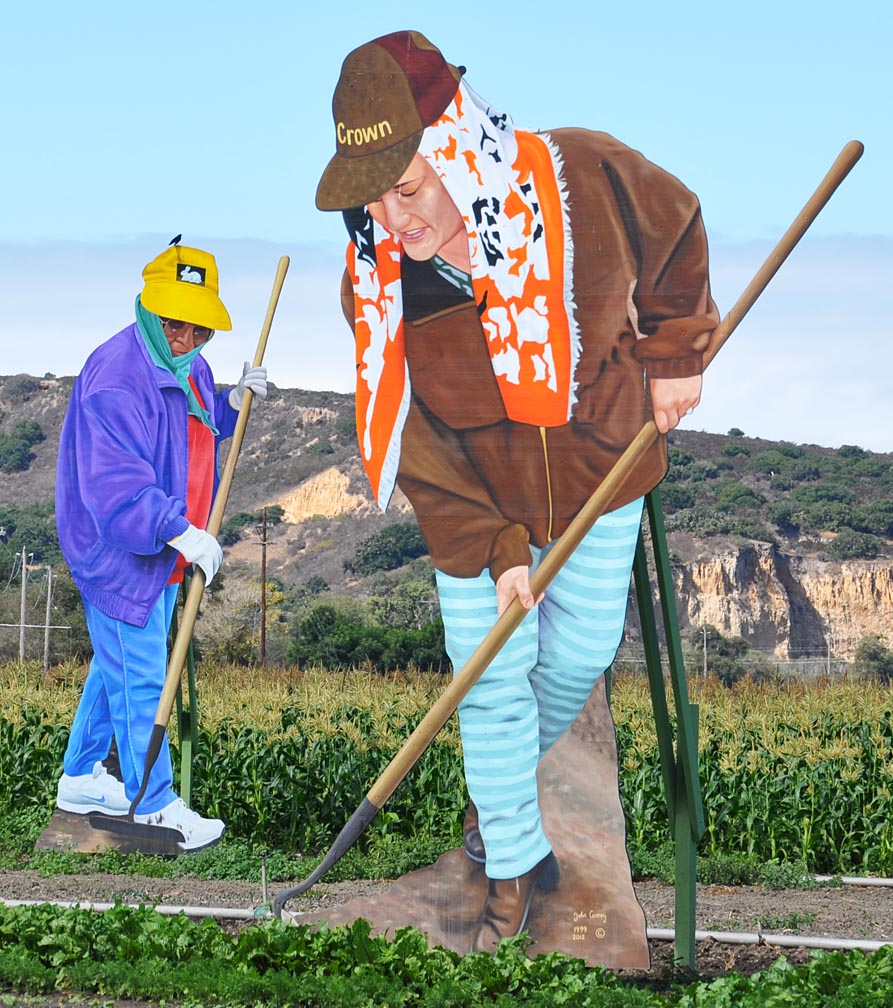 | John Cerney has been creating these larger than life, painted plywood figures since 1995. The earliest of these are heroic tributes to farmers and field workers near Cerney's hometown of Salinas, CA. Over the years, he has been commissioned to create hundreds of "cut-out murals" for display around the country. The figures are roughly 18 feet tall and depict real people. For more, see these websites: 1, 2, and 3. |