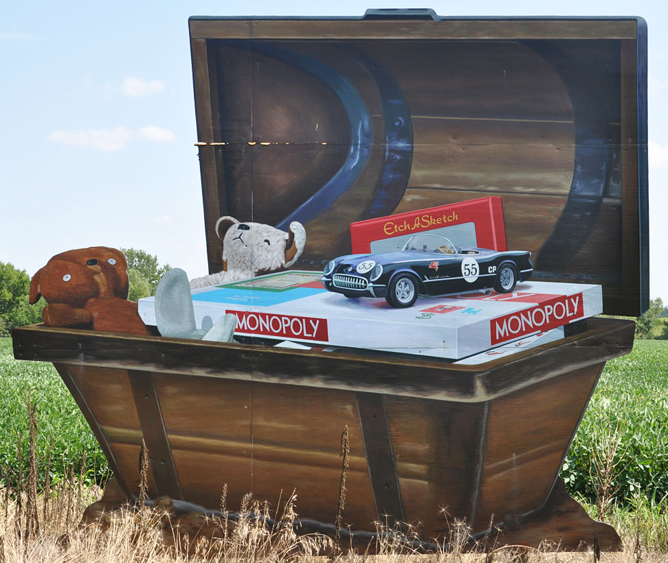 | Treasure Hunt was created in 2007 and installed in a farmer's field. It depicts two children who have dug up a treasure chest filled with vintage toys. By 2018, the signs were gone. In their place was a small Corvette sign which looks like a Cerney creation. That was gone by 2024. |