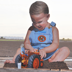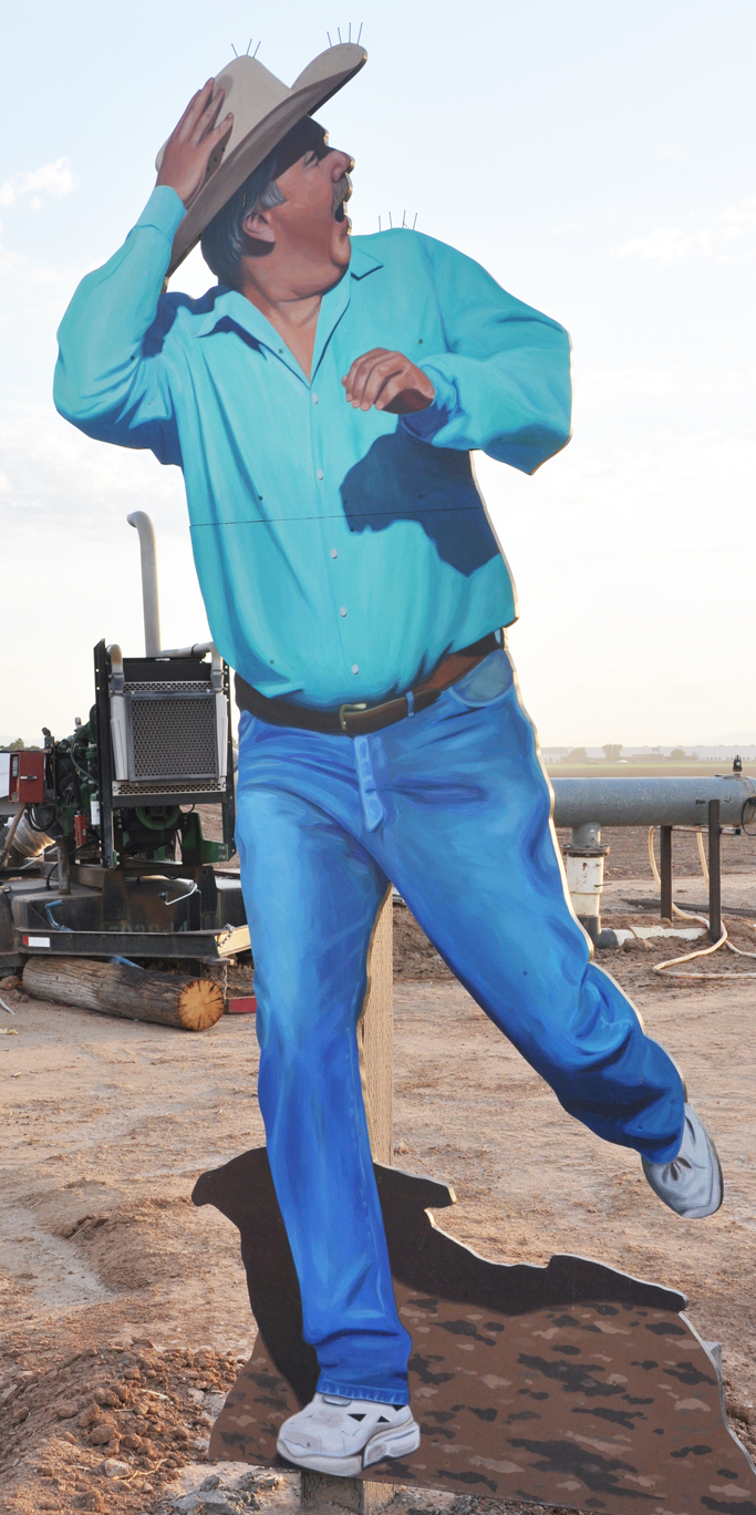 | The Big Baby with Tractors sign is about 20 foot tall. It was built in 1998 for Duncan Family Farms which was located next to the interstate. The farm closed in 2001 but the artwork was still visible from westbound I-40 until 2013. Over the years, the artwork had been vandalized with graffiti. The fleeing farmer was either stolen or destroyed. The head of the driver of the tractor that the baby was playing with also went missing. The scolding mother was gone by 2006. In 2013, the remaining figures were removed for new development. In 2020, Cerney recreated the Big Baby sign and it was installed near the Duncan Family Farms new location. For more, see this website. [map] |