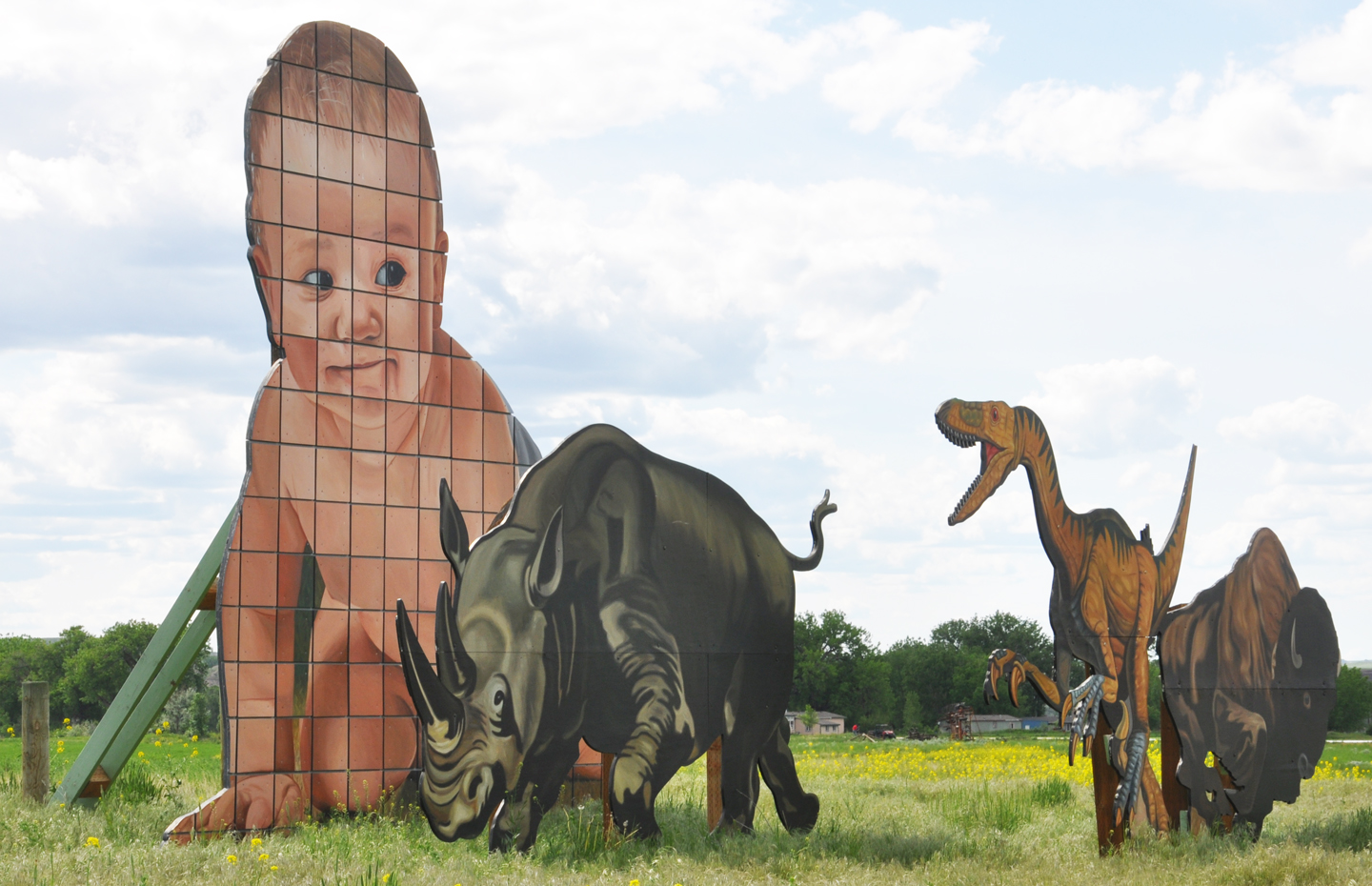 | This piece, entitled Creepy Crawler, depicts a 16-foot-tall baby, a rhino, a bison, and a velociraptor. It was installed next to the interstate on private property in 2015. [map] |