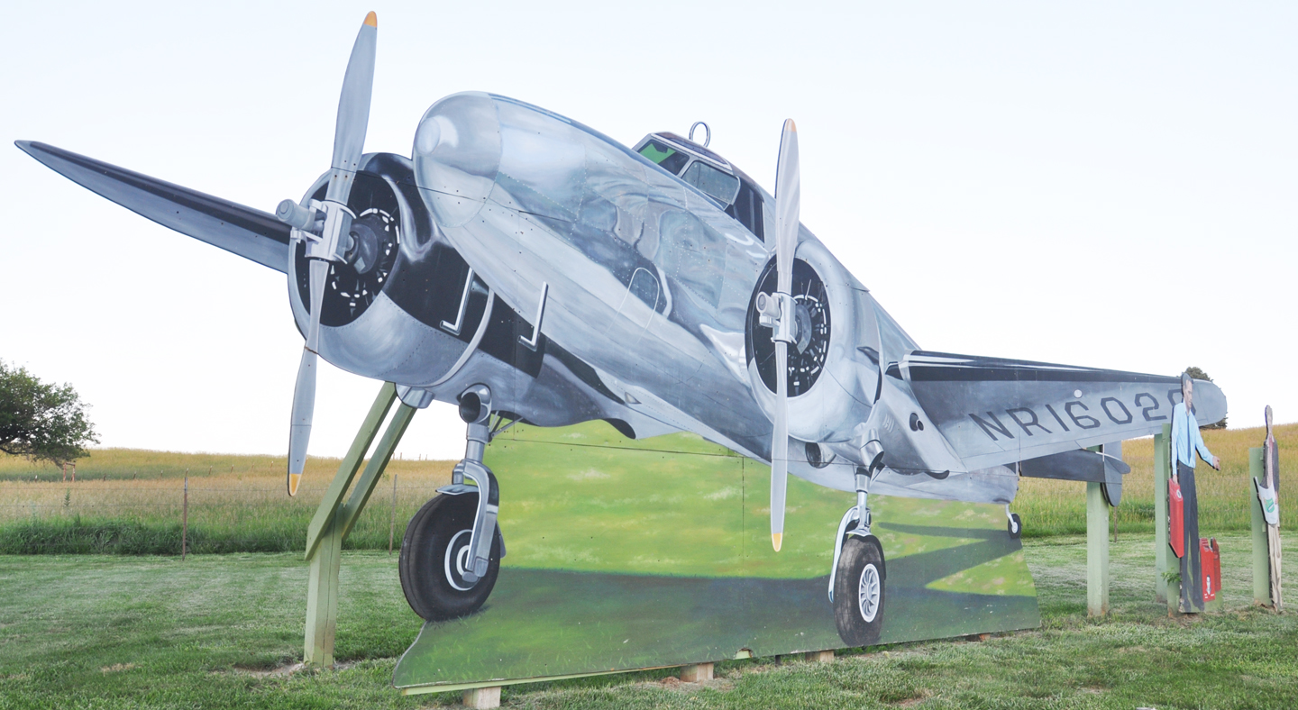| Amelia Earhart was born in Atchison. This 38 foot wide, 11 foot tall mural was donated by John Cerney in 2012. It is titled "Amelia Comes Home" and shows her with navigator Fred Noonan. The fantasy piece shows them running out of fuel and filling up in Atchison instead of disappearing over the Pacific Ocean. [map] |