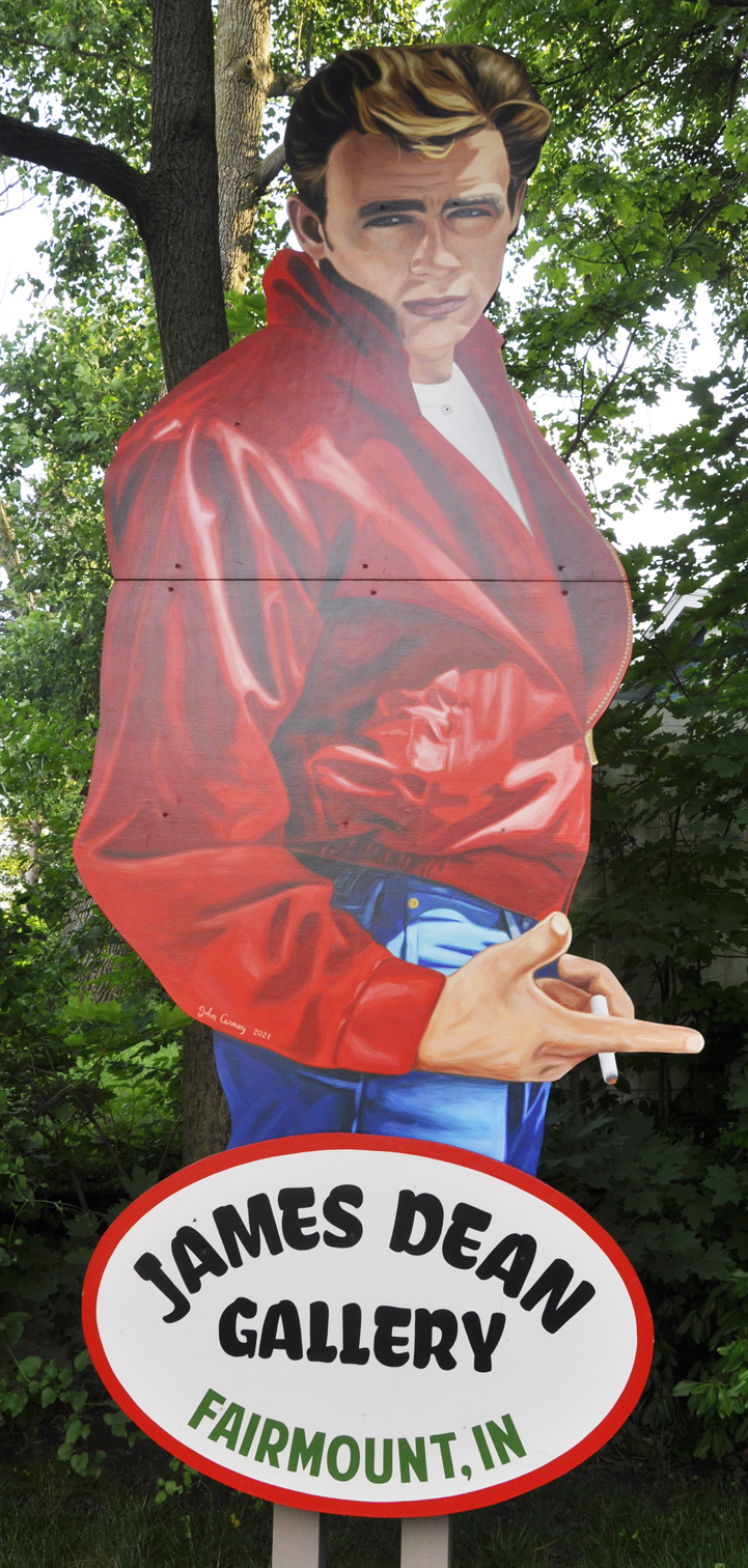| This James Dean sign was installed at the James Dean Gallery in 2021. In 2022, two more Dean signs were created by Cerney: a 12-foot-tall mirror image version was installed in Marion, IN and a 14-foot-tall depiction of Dean in "East of Eden" in Fairmount. Fairmount was James Dean's hometown and final resting place. [map] |