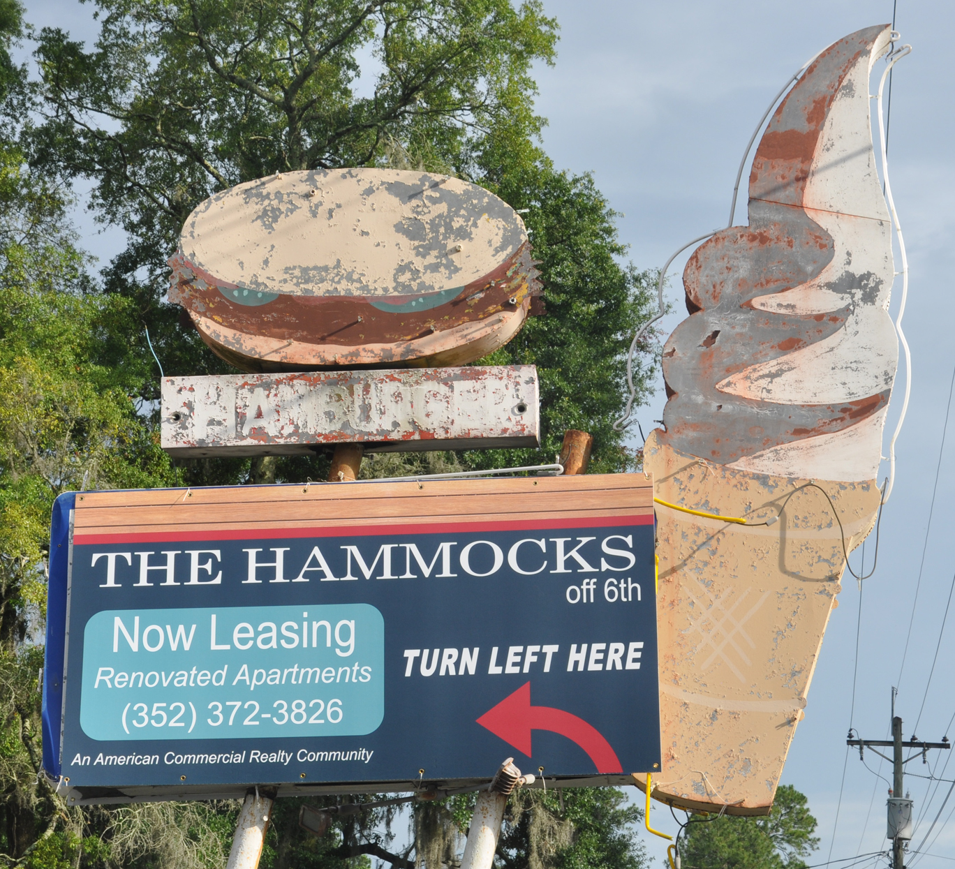 | Doug's Dairy Twist opened in 1964. The sign was built by Gainesville Neon & Signs. The name was changed almost immediately to Doug's Dairy Twirl when it was discovered that someone from another business in South Florida was already using the Dairy Twist name. The hamburger and text panel below it were later additions to the sign. The business operated until at least the late 1970s. It has been closed since at least 2007. The local Swamp Head Brewery produces ice cream flavored beer with the Doug's Dairy Twirl name. For more, see this website. [map] |