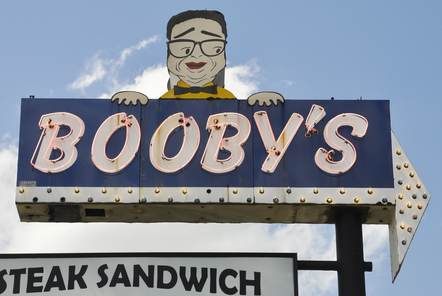 Booby's Charcoal Rib opened in 1961 and this sign is from then. The man depicted on the sign is restaurant's founder, Ronald "Booby" Friedman. [map] |