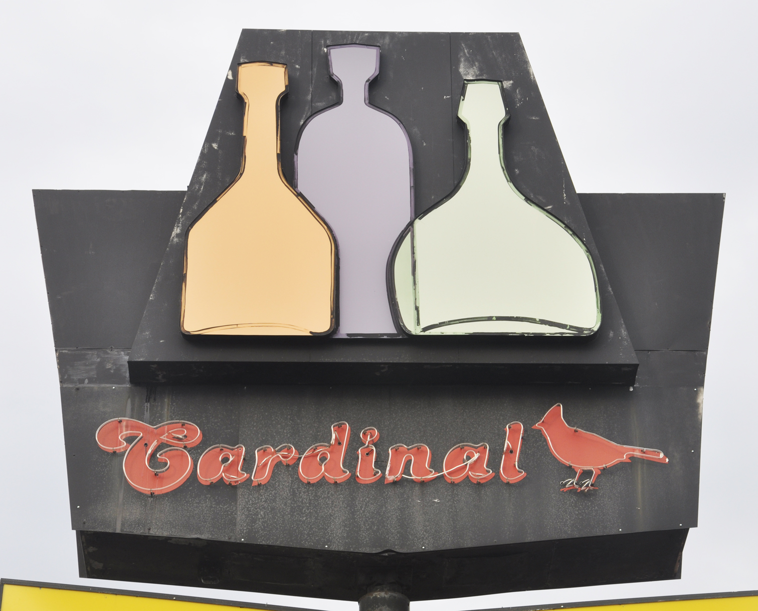 The first Les Brothers Restaurant opened in Toronto, ON in 1962. In 1973, this location opened. This 35-foot-tall sign was built then by Grate Signs in Joliet. In 2021, the sign's red, green, and blue neon tubing was removed and replacing with backlit plastic letters. These photos are from 2025. The 18-foot-tall arrow has about 700 chasing bulbs on each side of sign. The plastic "Cocktails" panel was missing when this photo was taken. The metal and plastic lantern at the top of sign is no longer lit. For more, see these websites: 1 and 2. [map] I believe the Cardinal Liquor Barn was originally known as the Liquor Barn and that this neon Cardinal text was added later. The sign might be from the 1950s or 1960s. The top panel with the bottles is identical to the one at the former Miska's Liquor Store in Blue Island, IL. [map] |