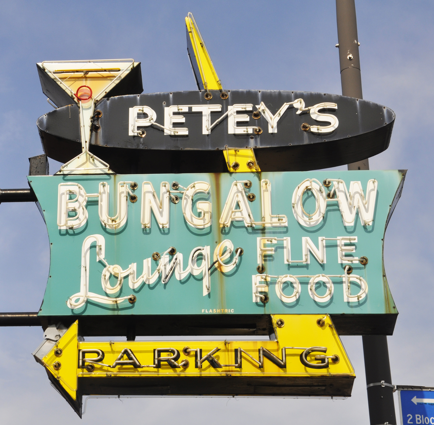 The Petey's Bungalow Lounge opened in 1961. This sign was built in 1965 by Flashtric. The restaurant and lounge closed in 2024 and the sign was removed in 2025. For more, see this website.
