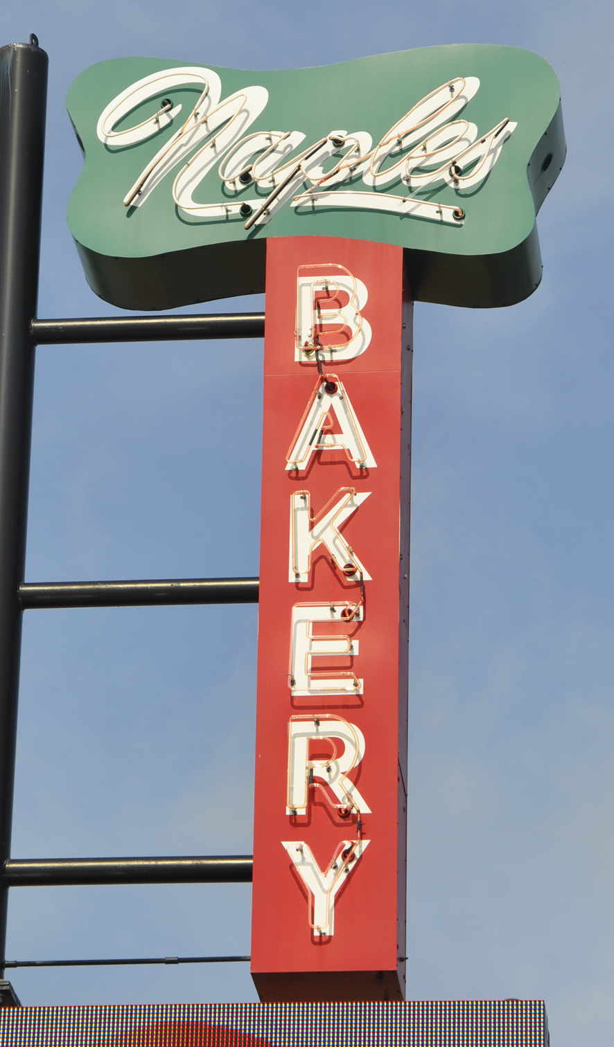 The Naples Bakery was established in 1918 in Chicago. This location opened in 1963 and closed in 2016. The sign was removed in 2017 and Barraco's restaurant expanded into the space. In 2018, a replica of the Naples Bakery sign was reinstalled on the building. A graphic display panel has replaced the readerboard. For more, see this website. [map] |