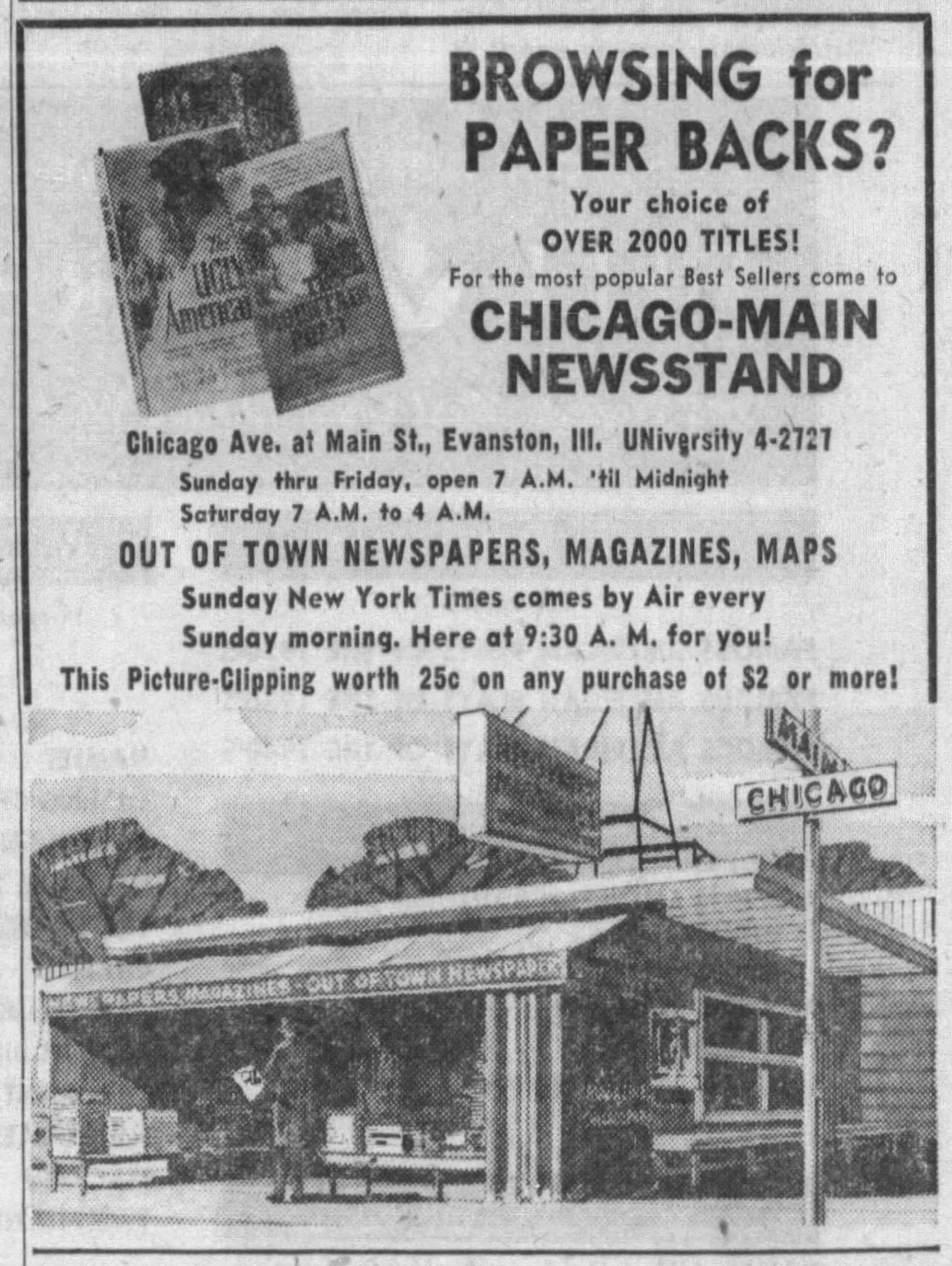 Bennison's Bakery opened in 1938 and this sign might be from then. For more, see these websites: 1 and 2. [map] The Chicago-Main Newsstand started out in the 1930s with a wooden shack selling newspapers. The business closed in 1993. In 2000, a new building was constructed on the site but this sign, which might be from the 1940s or 1950s, was restored and reinstalled. For more, see these websites: 1 and 2. [map] |