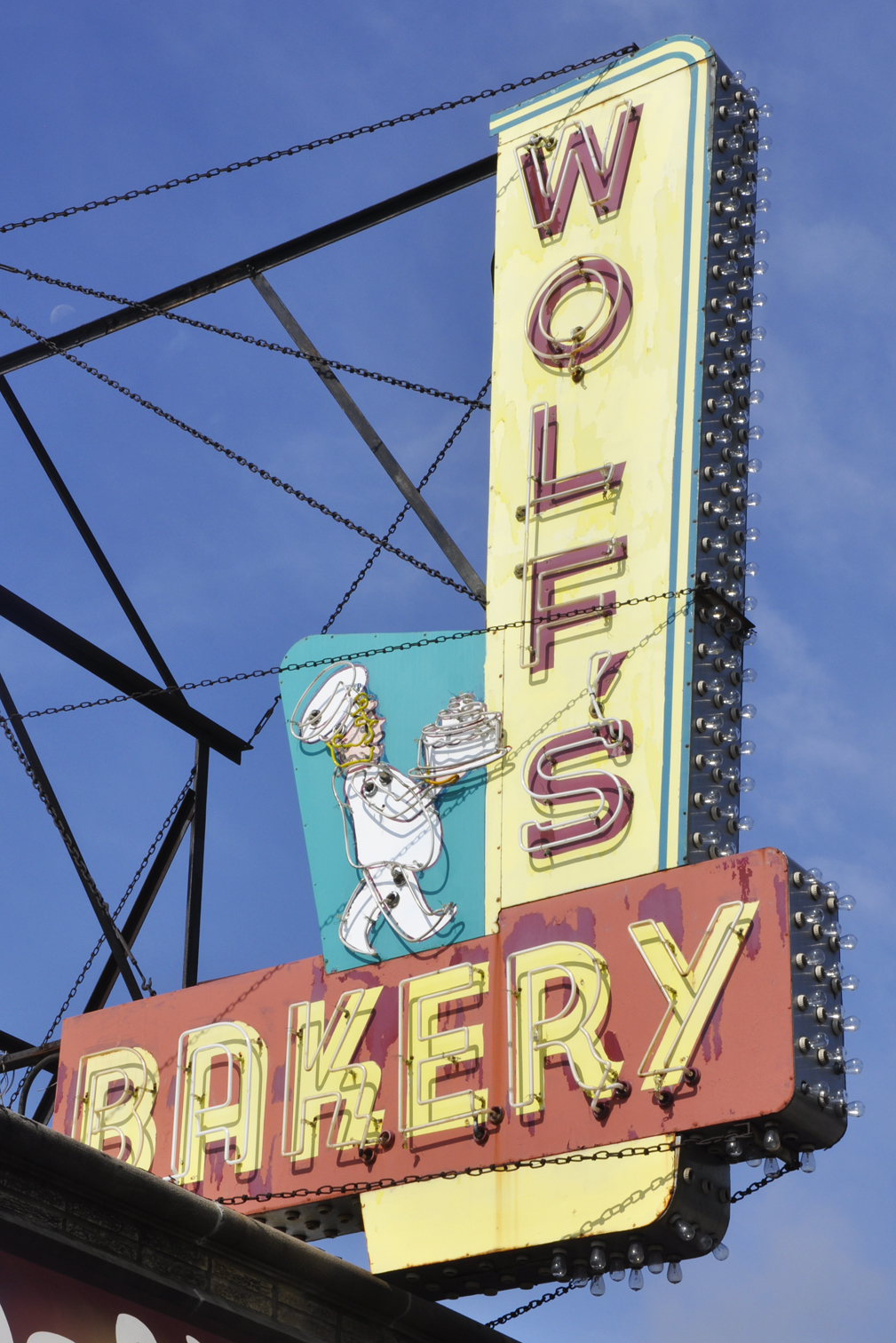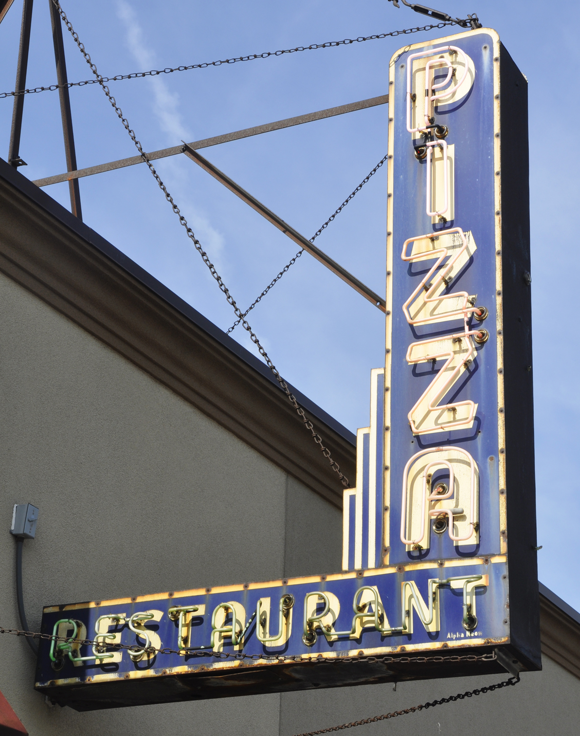 Wolf's Bakery opened in 1939. This sign is probably from the 1950s. When new owners took over in 1999, they had the sign repainted to its original colors. For more, see this website. [map] Rosangela's Pizza was established in 1955 and this sign appears to be from then. For more, see this website. [map] |