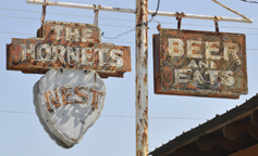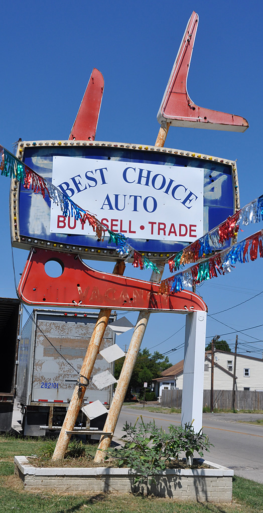 The Hornet's Nest Steakhouse was preceded by the Nine-Mile Road House in the 1910s and 1920s. The Hornet's Nest opened around 1930. In 1946, it was converted from a tavern into a restaurant. These signs may be from then. [map] This Best Choice Auto sign originally advertised for Schmidt's Motel. The motel was built in 1954 and this sign may be from then. It has the same design as the Faubus Motel in Huntsville, AR. I don't know if these motels were affiliated with a chain and if there were other signs like this. The used car dealer has moved but this sign remains with its tacked-on banner. [map] The Ye Olde Tyme Tavern sign was still there in 2010 when this photo was taken. By 2015, it was gone. |