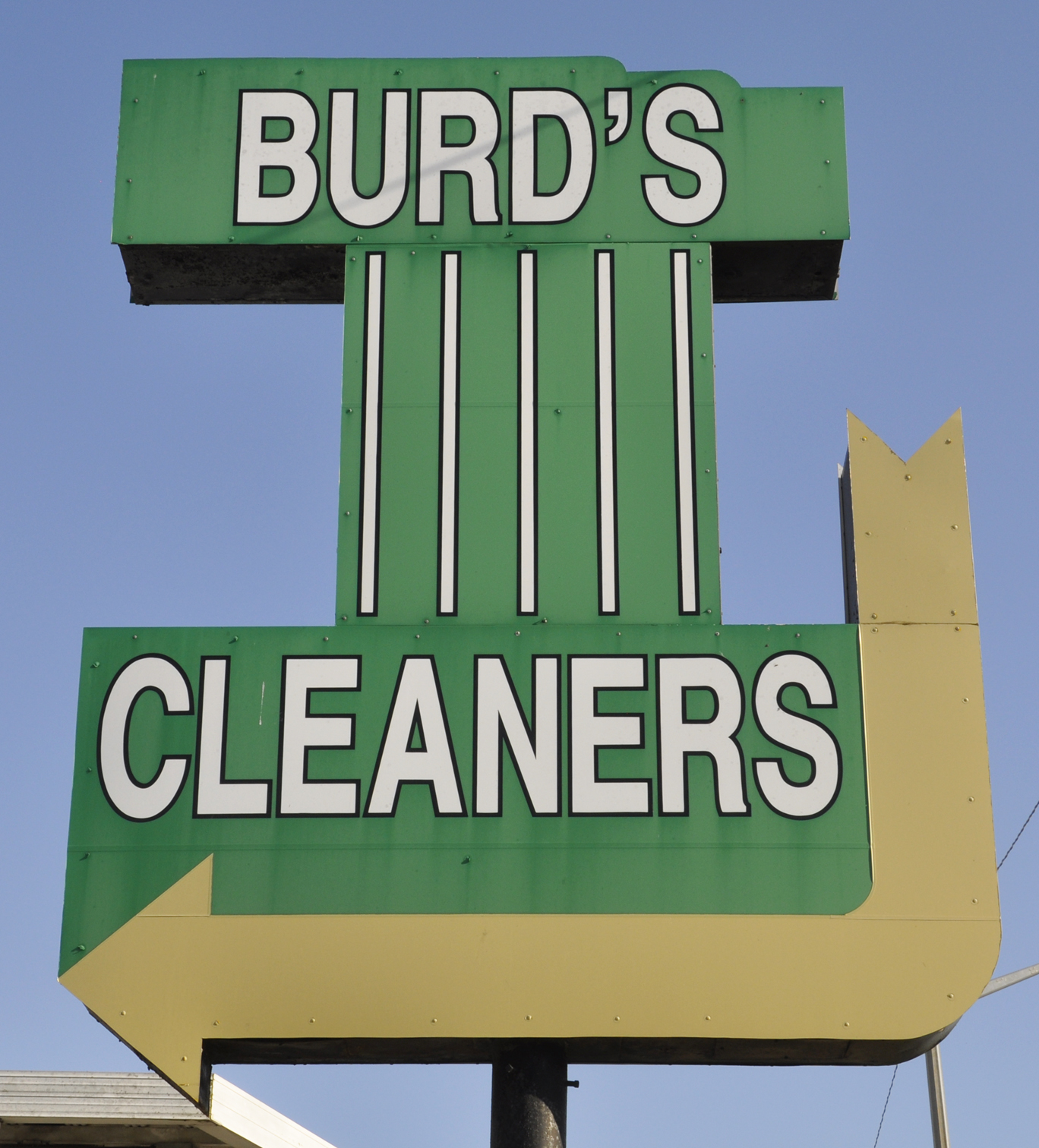 At one time, Burd's Cleaners had at least three locations in Columbus. All of them have closed. By 2014, the sign's neon was removed and the panels were repainted. It no longer has the One Hour Cleaning number or text. In 2025, the building was being remodeled for office space. [map] The One Hour Cleaning sign in Marion probably had an arrow panel originally like the Columbus and Jeffersonville signs. [map] The Jeffersonville One Hour Cleaning sign had a bulb-filled arrow rather than a neon one. This business moved in 2010 and the store was vacant when this photo was taken in 2010. At some point between 2012 and 2014, this building was demolished and the sign disappeared. For more, see this website. |