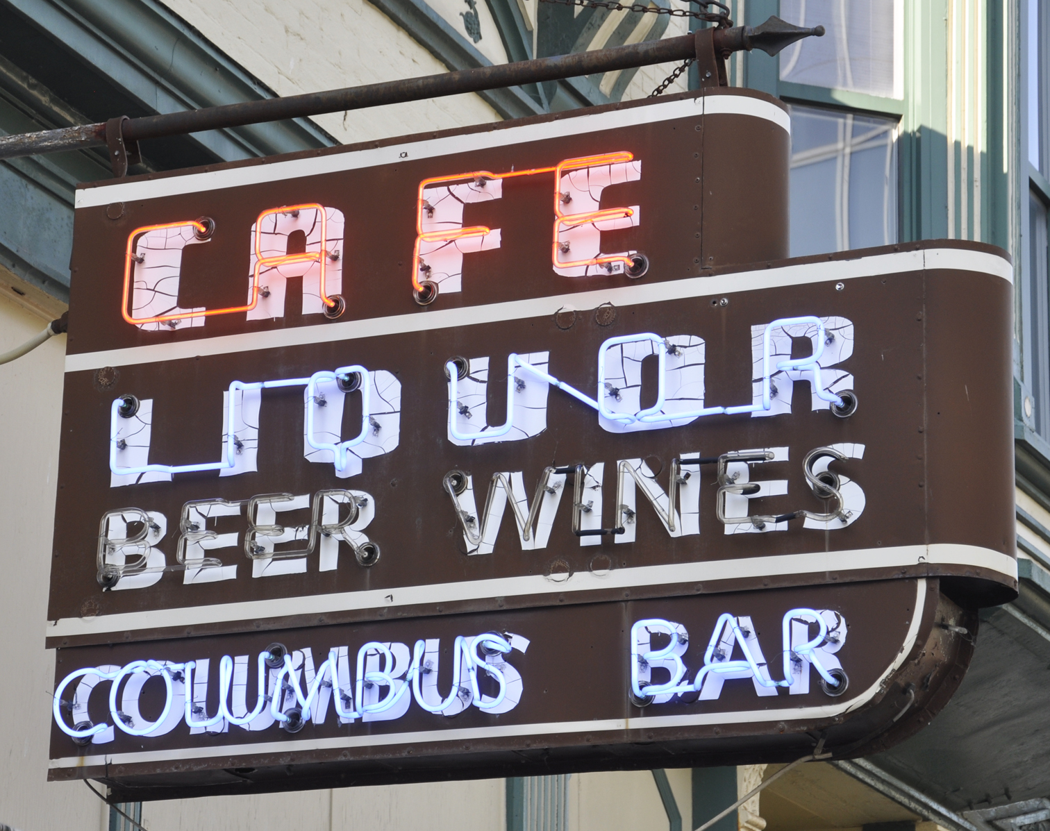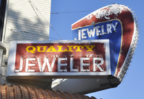 Art's Cleaners was established in 1946. This store had opened by 1956. These signs may be from around then. For more, see this website. [map] The Columbus Bar opened in 1939. This sign is probably from the 1940s or 1950s. [map] Max's Jewelry opened 1972 and is closing in 2026. This sign was likely adapted from the store's previous occupant, the Parker Drug Store which had been there for many decades. [map] |