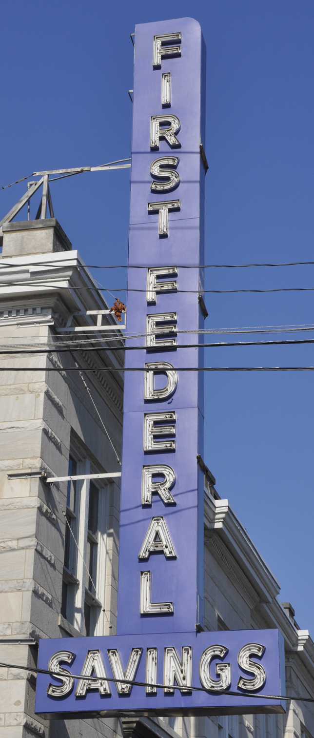 This First Federal Savings Bank was built in 1904 and is still operating. The sign is probably from the 1950s. For more, see this website. [map]