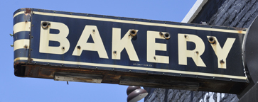The Miller Bakery opened in 1941 and this sign is from then. The business closed around 2010. It reopened as the Miller Bakery and Cafe in 2013 but closed in 2019. In 2023, the building began housing Tiny's Coffee Bar and this sign remains. [map] |