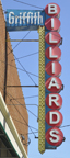 | The Griffith Furniture store opened here in 1963. This sign is probably from then or it might have been adapted from a previous business since it appears to be from the 1950s. The store had been closed by 2008. In 2013, the sign was adapted with backlit plastic letters for Griffith Billiards. The bulbs and neon at the top of the sign were kept. For more, see this website. [map] |