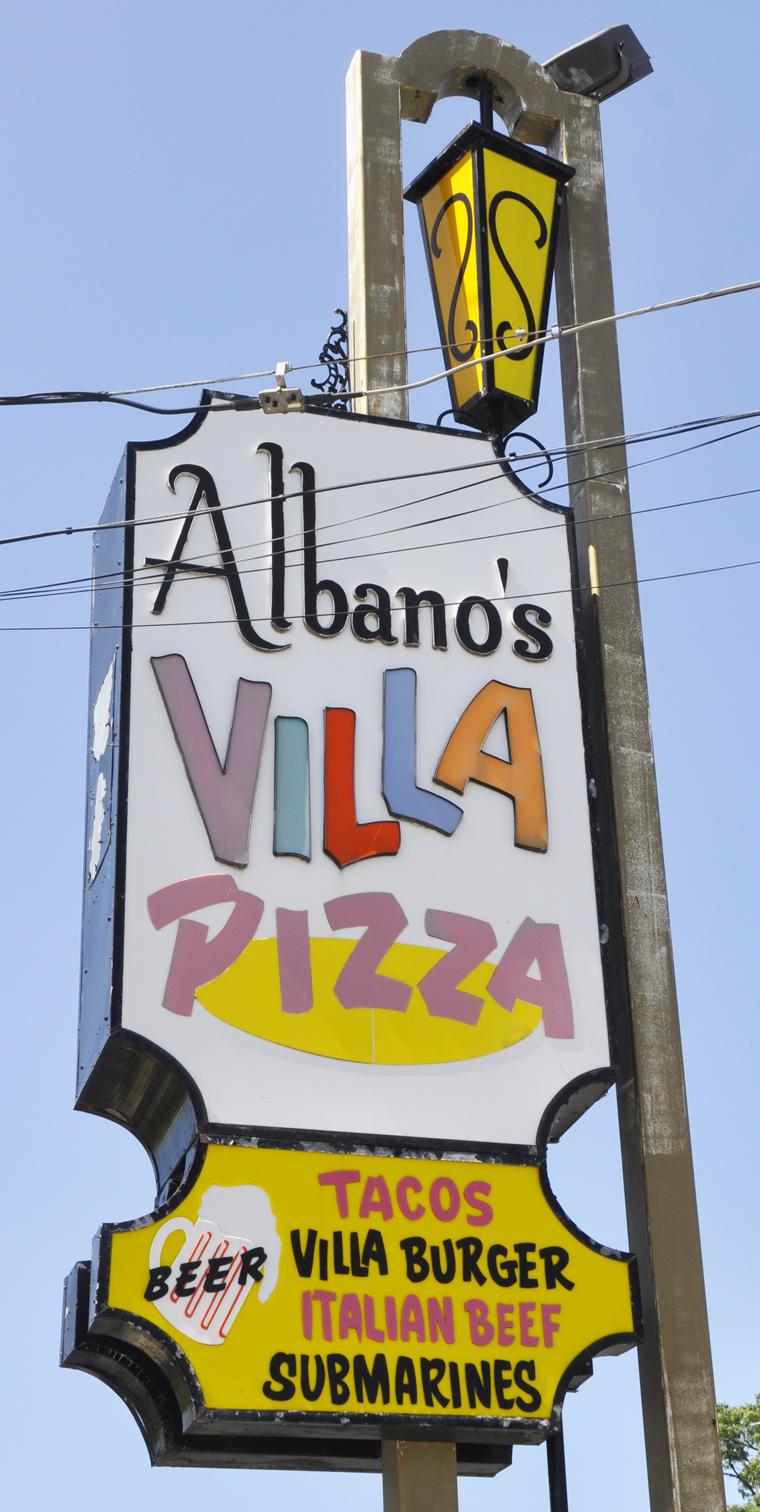 Albano's Villa opened in 1957. The restaurant moved moved down the street in 1969. This sign is probably from then. There are now two other locations in La Porte, IN. [map] The Evergreen Park Business Center sign was probably built in the 1950s. It appeared to have had neon originally. The Enterprise panel was probably originally a message board which was replaced sometime after 2009. This photo is from 2012. By 2018, the sign was gone. For more, see this website.  |