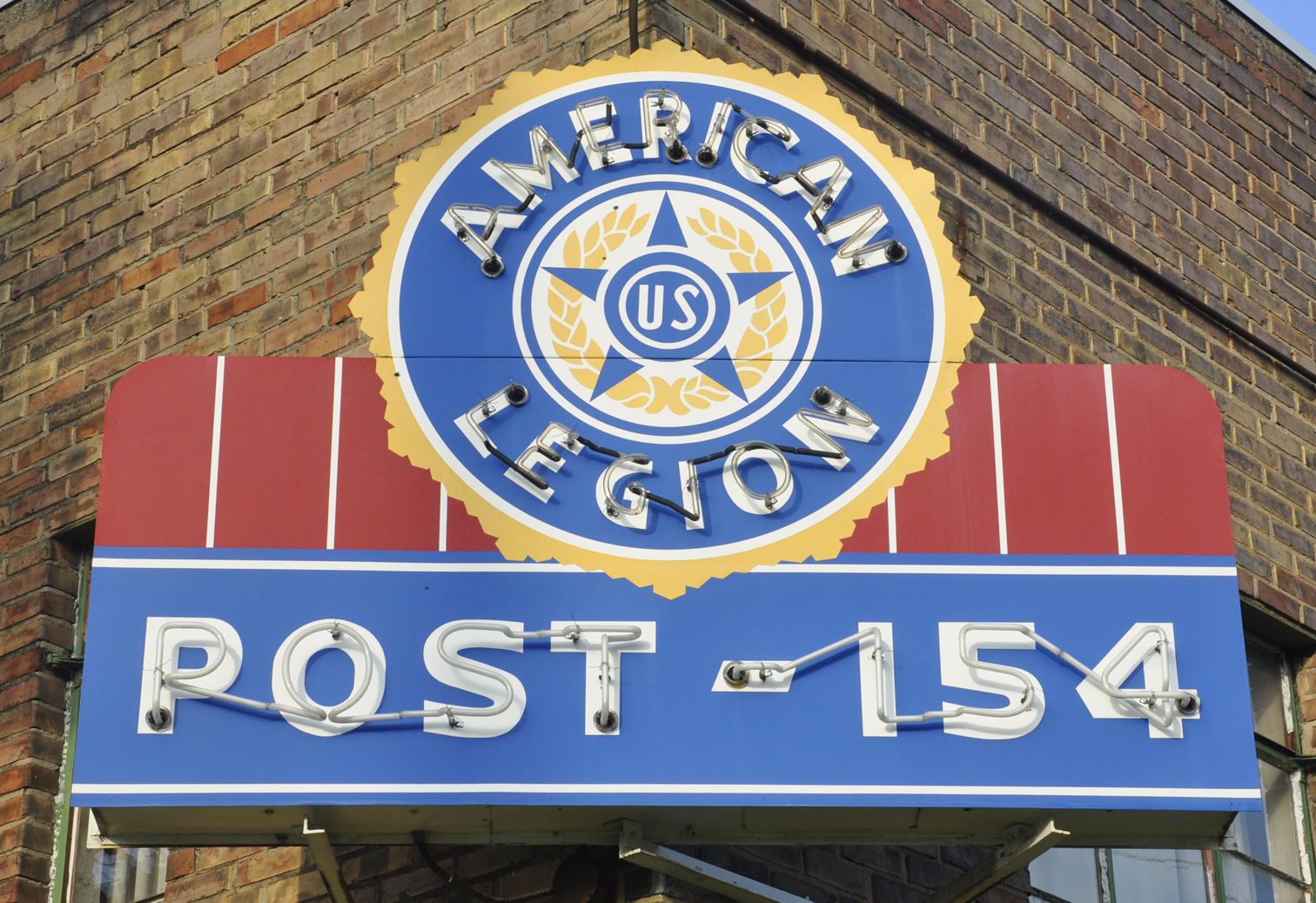 This American Legion post was established in 1919 and moved to this building in 1940. This sign is probably from the 1950s or 1960s. It was restored sometime after 2013. For more, see this website. [map]  |
