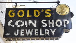 Gold's Coin Shop had opened by 1946 as the Gold's Pawn Shop and Jewelry Store. This sign may be from them. By 2012, the text in the middle of the panels had been changed to "Coin Shop." Around 2014, the three balls on the sign which represented a pawn shop were replaced with a coin. For more, see this website. [map] |
