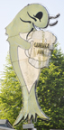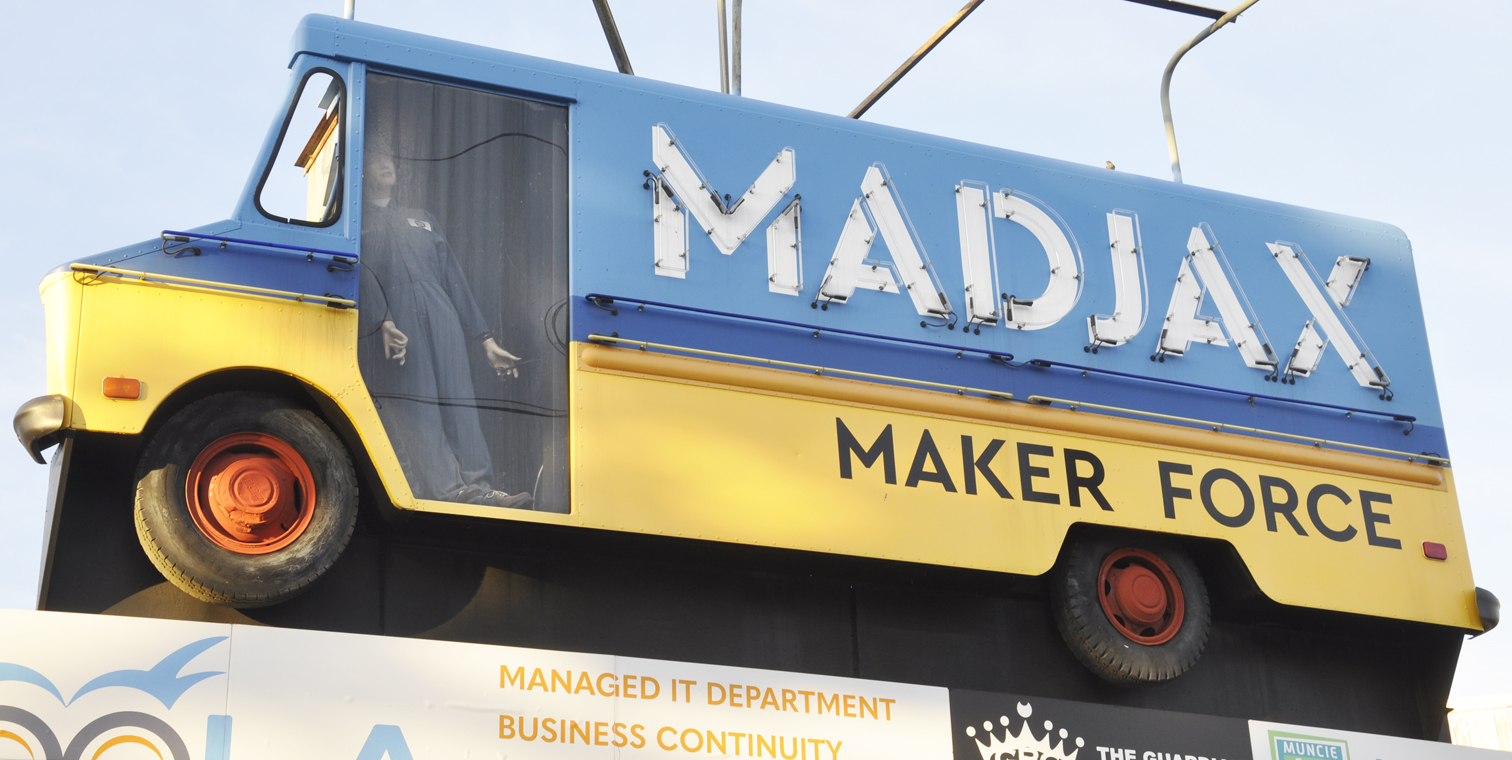This Cintas uniform rental sign featured a mannequin inside the truck named "Tim."  In 2020, the sign was restored and adapted for MadJax Maker Force, a community organization of makers, employers, and educators.  The readerboard was replaced with a billboard and Tim has a new uniform. For more, see this website.  [map]