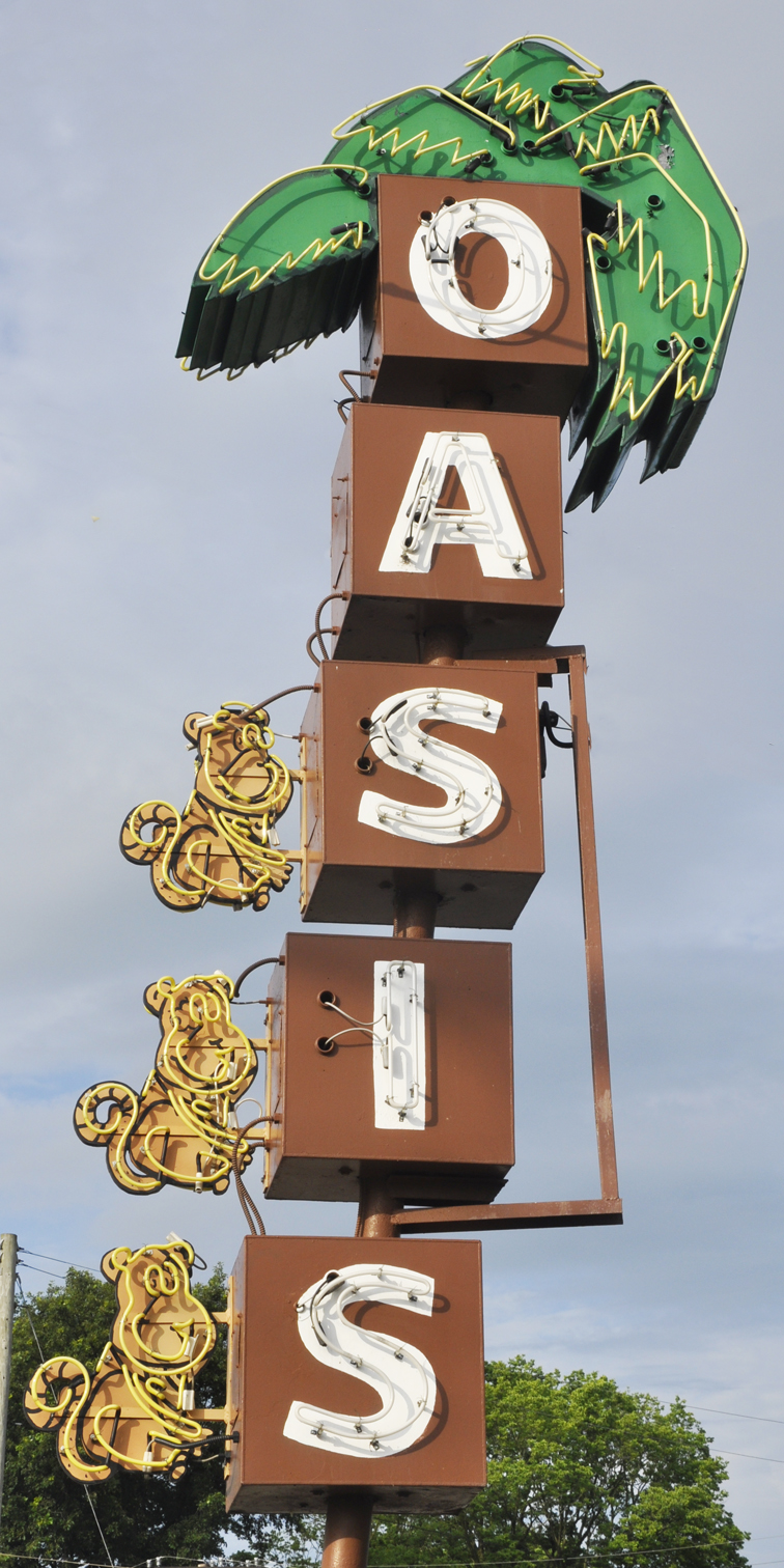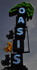 | The Oasis Bar & Grill opened in 1952 and this sign was installed then. The sign had not been fully lit since at least the 1980s. In 2021, it was restored by Finyl Vinyl Signs. There was a 20-foot-tall chainsaw carving of a basketball player in front of the bar in the early 2000s. By 2005, all that remained was his shoes. Those were gone by 2021. [map] |
