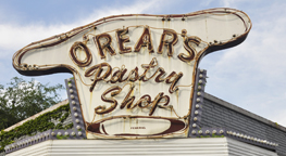 | O'Rear's Pastry Shop was established in the 1920s. In 1957, the shop moved from its original location to this one. This sign is probably from then. By 2017, LED plastic tubing had been installed on top of the neon. For more, see this website. [map] |