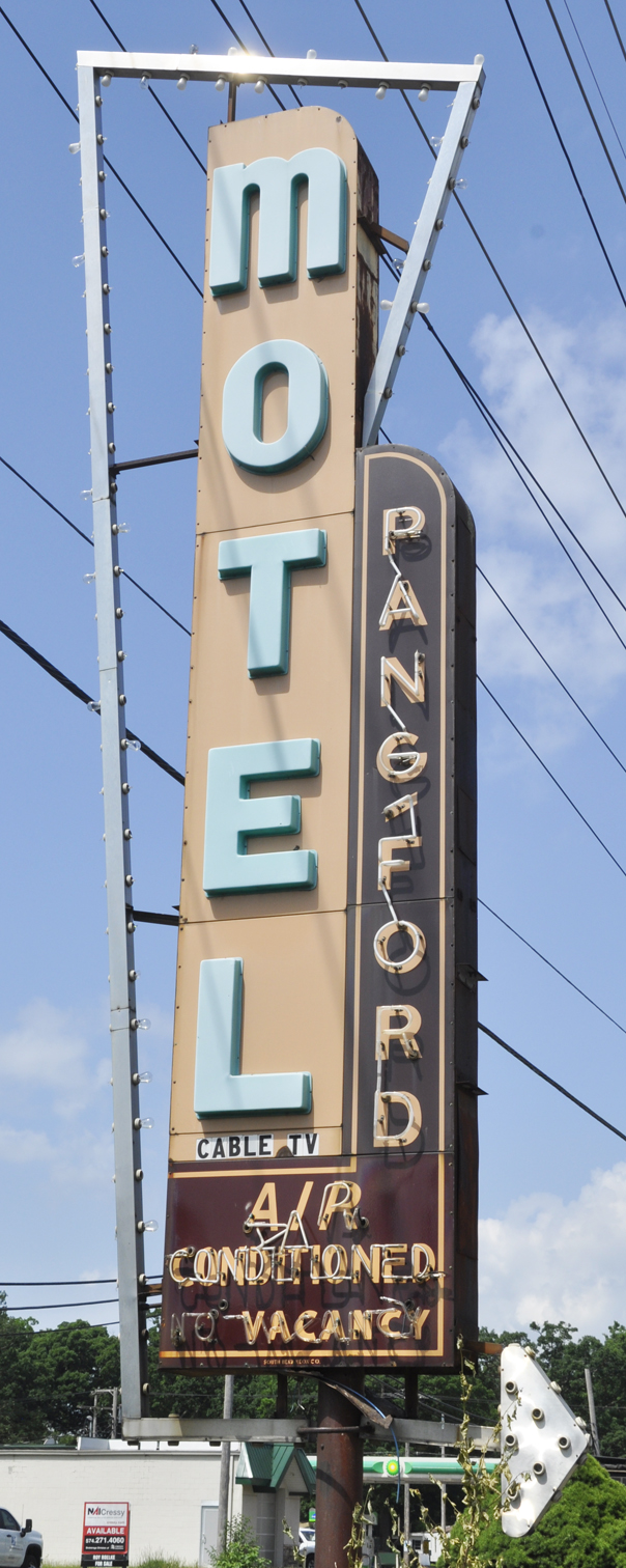 The Pang-Ford Motel had opened by 1954 and this sign appears to be from around then.  The metal bars with bulbs were added later, probably in the 1960s. The plastic "Motel" letters surely must have been neon originally.  There was a fire in 2025 and the motel is closed now. For more, see this website. [map]