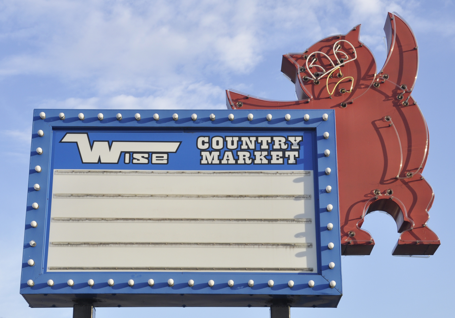 | This sign originally belonged to a Wise Food Market which closed sometime in the 1990s. The store housed a couple of other supermarkets after that. Around 2013, the sign was removed and restored. It is now installed at the Wise Country Market. [map] |