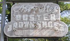 | This Buster Brown Shoes sign is part of a private collection displayed in front of a residence. I don't know where it came from. I believe the top reads "Shu Stop." This sign has been at this location since at least 2013. The paint on the bottom of the panel read "X-Ray Fitting" but that was probably not the original text. [map] |