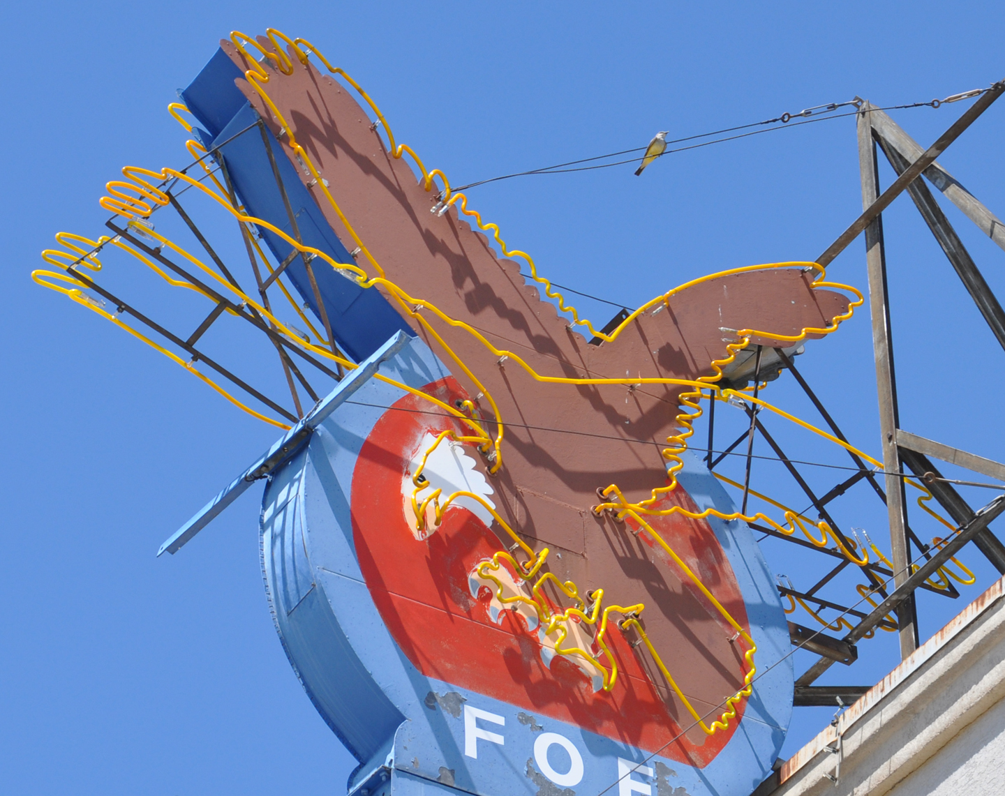 | This Fraternal Order of Eagles was built in 1946. These signs may have been installed then. If not, they were there by the early 1950s. The sign was restored in 2011. These photos are from 2023. The projecting sign's eagle has flapping, animated wings. For more, see these websites: 1 and 2. [map] |