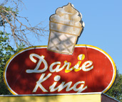 This former Hen House sign is located behind the windmill building. It was originally installed at the Park City, KS location. When the restaurant closed, the sign was removed by Luminous Neon. The sign was eventually sold at auction to a friend of this property's owner. For more Hen House signs and buildings, see this page. [map] The Darie King restaurant might be from the 1950s or 1960s. Does anyone know the history of this place? It appeared to be closed when this photo was taken in 2010. By 2012, the sign was gone. For more, see this website. |