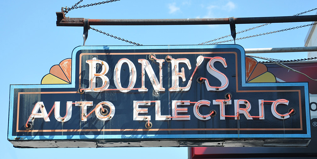 The Bone's Auto Electric & Air sign appears to be from the 1940s or so. [map] |