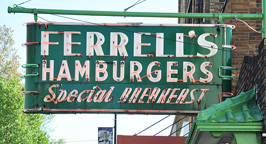 Ferrell's Hamburgers opened in Owensboro, KY in 1929. This location opened in 1936. By the 1940s, a location in Madisonville opened. There were other locations in Bowling Green, Henderson, and Clarksville. A new location in Cadiz opened in 1976. This sign is probably from the 1940s. In 2023, a corner of the sign was clipped by a truck. The neon will either be restored or the restaurant will replace the sign with a new one. For more, see these websites: 1 and 2. [map] This Kentucky Ice Cream sign continued to hang although there was no ice cream shop below it. I don't know if Kentucky Ice Cream was a brand or a chain of stores. By 2018, there was a new sign for the Midway Cafe in its place. The ice cream cone has also been replaced with another one. |