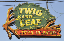 The Twig and Leaf Restaurant had opened on Frankfort Ave. by 1954 and this sign is probably from then. By 1962, the restaurant and sign had moved to its current location. For more, see this website. [map]