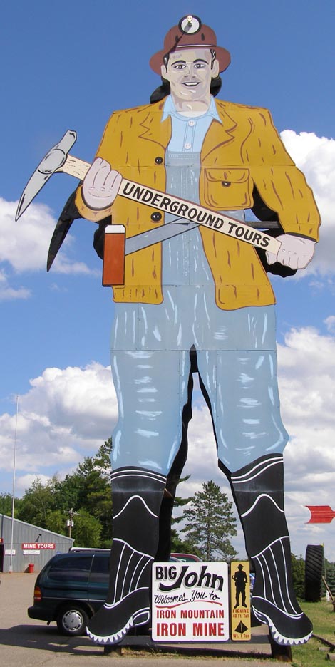 Big John is a 44-foot-tall wooden sign that stands in front of the Iron Mountain Iron Mine. The sign was built in 1962 and it has been repainted about seven times since then. Around 1999, the sign was "redone" with marine plywood to prevent it from peeling. The Iron Mountain Mine features mine tours and a gift/rock shop. In 2022, the sign was restored with the face changed back to the original look, representing the owner Eugene Carollo. For more, see these websites: 1 and 2. [map]