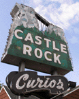 The Castle Rock Curios sign is probably from the 1950s. It had neon letters originally. This tourist attraction consists of a hiking trail up to the top of Castle Rock, Paul Bunyan and Babe the Blue Ox statues, and a souvenir shop. Castle Rock has been a tourist attraction since 1928. For more, see these websites: 1, 2, and 3. [map]