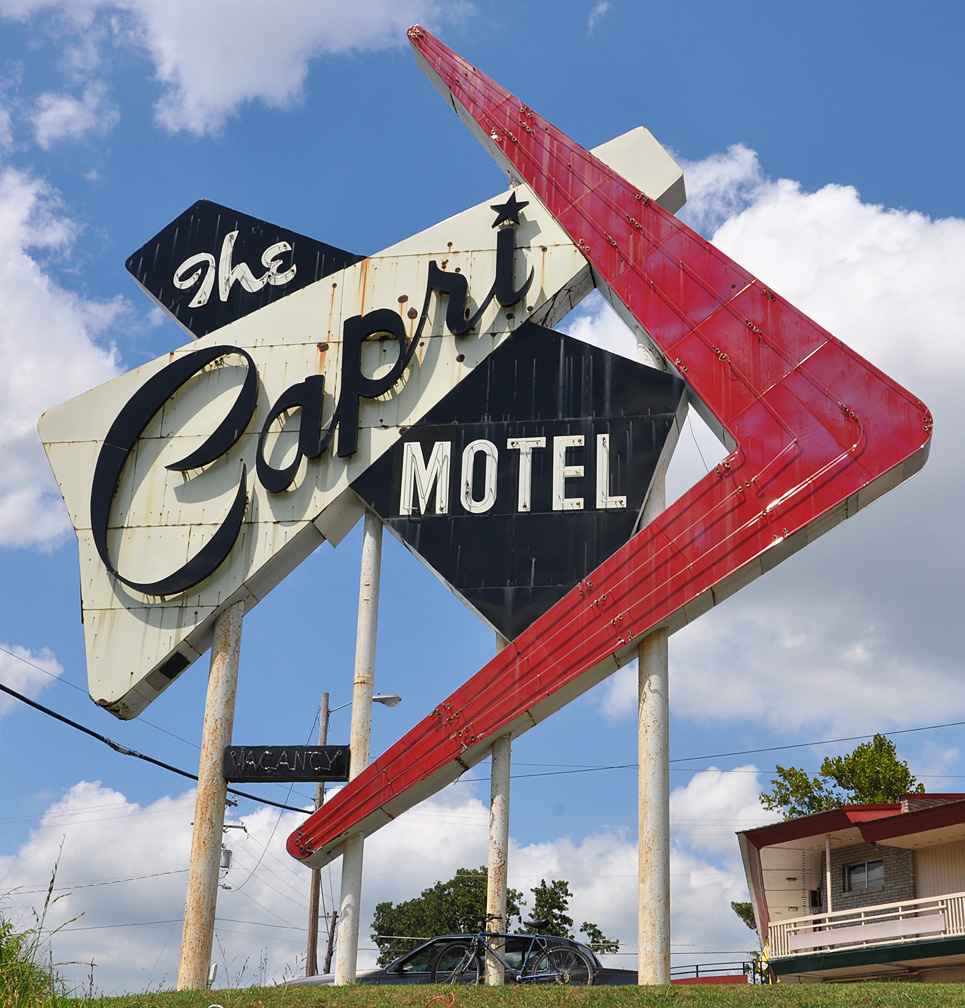 This Coca-Cola sign at Woody's Wood-Fire Pizza was probably a liquor store bottle sign originally. [map] The Capri Motel opened in 1962 as a Capri Motor Hotel. The sign is about 40 feet tall. The motel was demolished in 2013. The sign was saved and disassembled. During the removal, the underlying "Hotel" panel was found underneath the "Motel" panel. The sign's new owner hopes to reinstall it at another location in town. It was still in storage in 2018. There were other Capri Motels with the same sign in Lawton, OK; Oklahoma City, OK; and Albuquerque, NM. There may have been others. There were also at least three identical signs for Flamingo Motels in Elk City, OK, Jackson, MS, and Waco, TX. There was also a Sands Motel in Tulsa, OK, a Rio Motel in Fort Worth, TX, and a Town & Country Motor Hotel in Wichita Falls, TX with the same sign design. I'd love to know if there was a relationship between these motel chains. For more, see this website. |