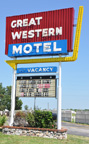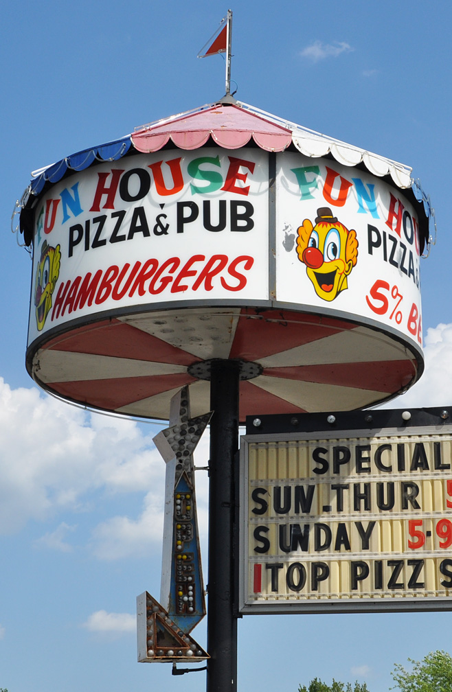 This Vickers gas station had been closed for years but the building and sign remained. Vickers Petroleum was a Kansas-based refining and marketing company. By 2019, the sign was gone. For more, see these websites: 1, 2, and 3. This Great Western Motel sign was from the 1950s. The sign originally had a horse and cowboy with a neon lasso on the upper right. There was also an AAA logo attached to the upper left. There was also another panel below the arrow which advertised television, air conditioning, etc. The motel was demolished around 2022 and this sign is gone. For more, see these websites: 1 and 2. This Fun House Pizza location opened in 1968. The circus tent part of the sign originally revolved. It no longer does. For more, see this website. [map] |