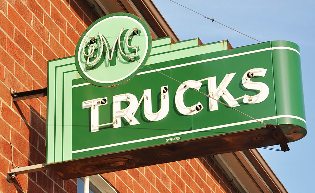 This GMC Trucks sign is installed at Weber Motors. The signs were mass-produced in the 1940s. I only know of one other one in Nunda, NY. The signs are now being reproduced. For more, see these websites: 1 and 2. [map]